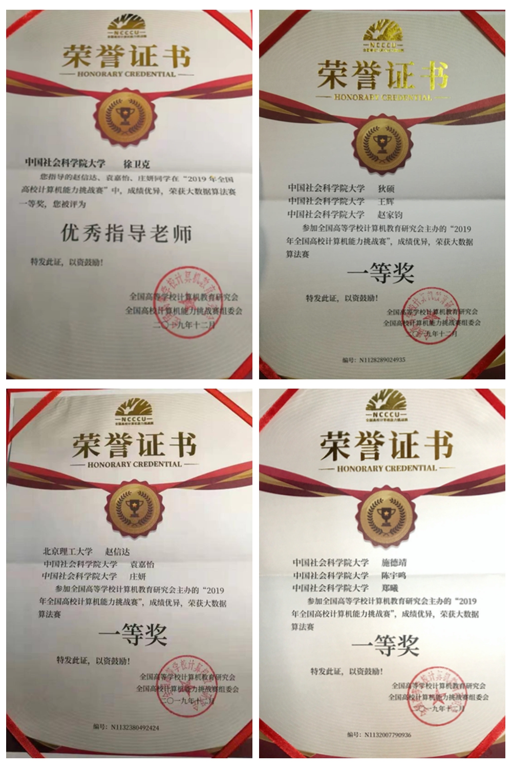 20191127日晚,伴随着最后一次单击提交,为期27天的计算机能力挑战赛落下帷幕。在教务处和优德w88 的通力支持下,在优德w88学子的艰苦努力下,优德w88参赛队一举摘取全国决赛5个一等奖、1个二等奖和3个三等奖。大数据算法赛获一等奖的3支队伍为施德靖、陈宇鸣、郑曦团队,狄硕、王辉、赵家鈞团队和赵信达(北理工)、袁嘉怡、庄妍团队。Office高级应用赛获一等奖的为杨君慧,获二等奖的为王艺霏,获三等奖的为庄妍。徐卫克获优秀指导教师奖。