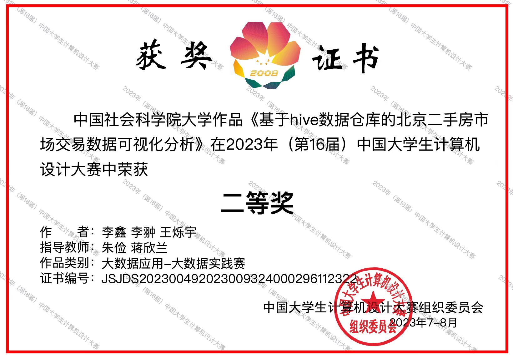 朱俭老师和蒋欣兰老师的指导下,参加了新苗学术竞赛项目。他们的作品《基于Hive数据仓库的北京二手房市场交易数据可视化分析》在2023年(第16届)中国大学生计算机设计大赛(简称4C)的北京市“大数据应用”赛道中脱颖而出,并被推荐参加国赛。