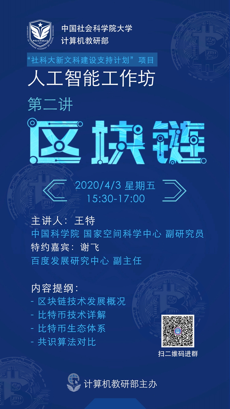 优德w88 “人工智能”系列工作坊第二讲主题为“区块链技术”。届时将约请中国科学院国家空间科学中心的王特副研究员线上主讲,直播时间定于4月3日15:30,直播平台使用“腾讯课堂”()。