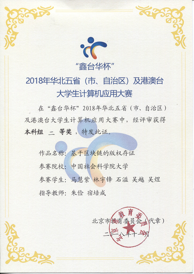 2018年11月10日,优德w88优德w88 组织学生参加了2018年华北五省(市、自治区)及港澳台大学生计算机应用大赛决赛答辩。此次竞赛在北京联合大学开展,吸引了华北五省、市、自治区以及台湾的近百所高校报名参赛,经过各赛区预赛选拔,来自5个分赛区的91支代表队进入总决赛答辩。在有众多理工类和综合类院校参赛的情况下,学生团队凭借作品 “基于区块链的版权存证”获得总决赛二等奖。