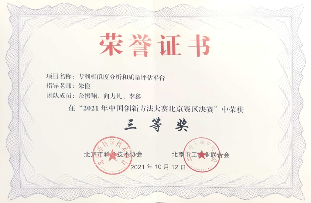 20218月至10月,优德w88学生团队在优德w88 朱俭老师的指导下,参加2021年中国创新方法大赛,该团队由2019级余振翔,2019级向力凡,2020级李鑫三位同学组成,作品“专利相似度分析和质量评估平台”荣获北京赛区决赛三等奖。